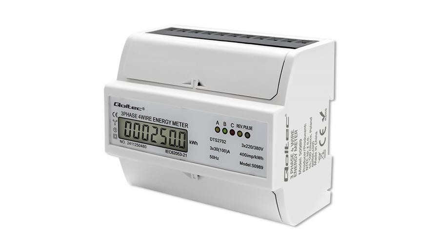 Contor de energie trifazat Qoltec | Afișaj LCD | Clasa 1.0 | Șină DIN | 3x30(100)A
