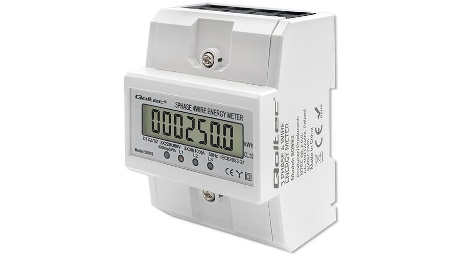 Contor de consum de energie trifazat Qoltec | Afișaj LCD | Clasa 1.0 | Șină DIN | 3x30(100)A