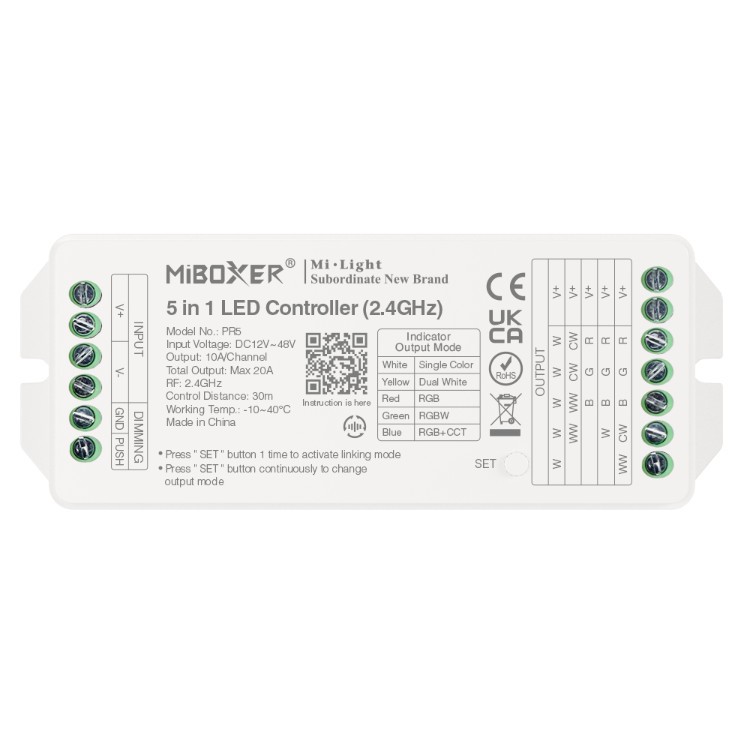 PR5 – 5 in 1 LED Controller (2.4GHz) este un controller avansat care utilizeaza tehnologia wireless 2.4GHz, permitand controlul iluminatului prin telecomanda, smartphone sau prin control la distanta lunga (prin gateway 2.4GHz). Acest controller este ideal pentru utilizarea in iluminatul hotelurilor sau al locuintelor, oferind multiple optiuni de control pentru lumina: RGB, luminozitate, si temperatura de culoare. Un singur controller poate fi compatibil cu pana la 12 telecomenzi, ceea ce ofera o gestionare simplificata si eficienta a iluminatului in spatii mari.