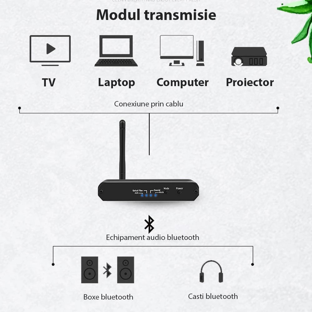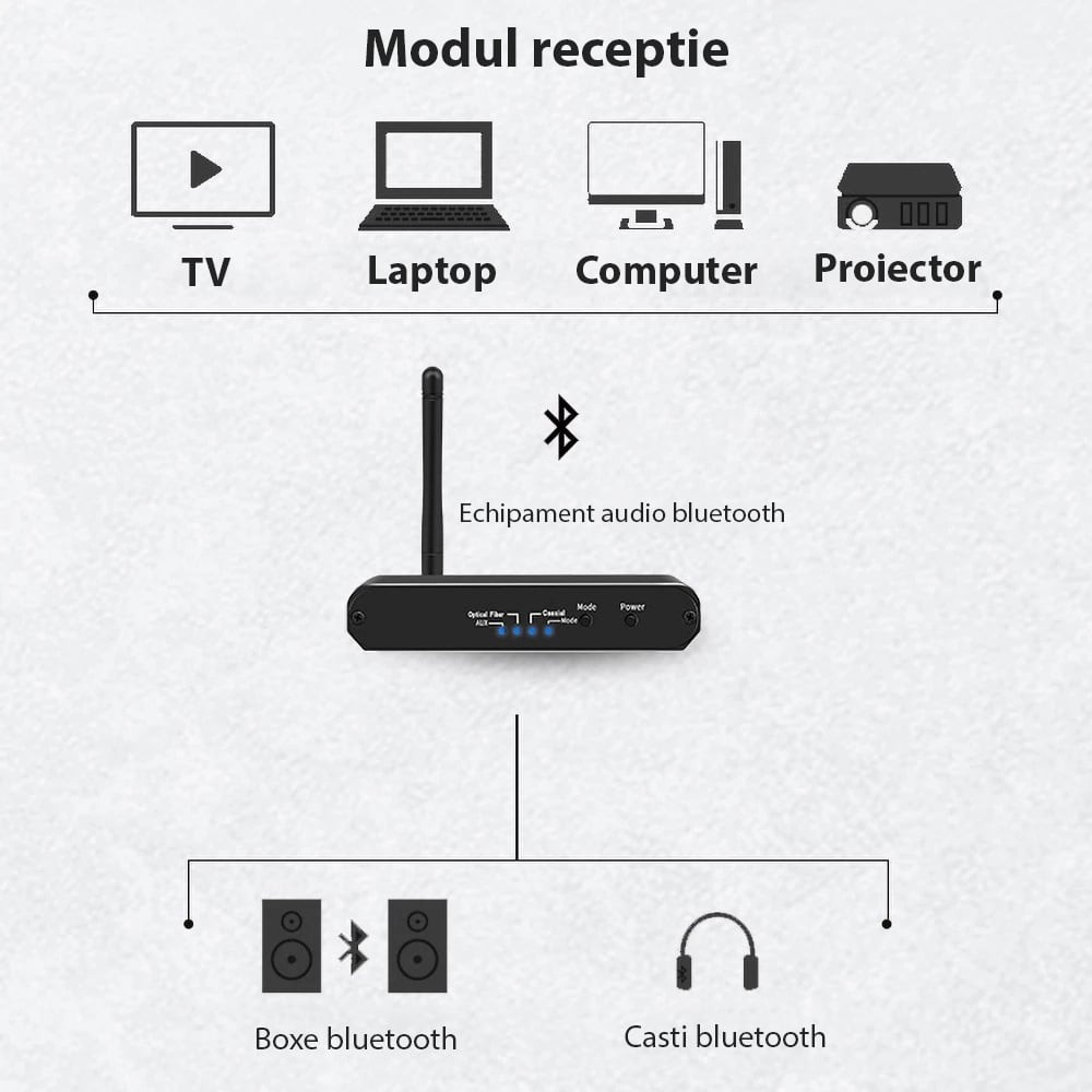 Convertor Audio Digital la Analog Techstar® OT15, Compatibil Bluetooth 5.0, DC 5V, AUX 3.5 mm, Cablu audio optic, RCA, Negru