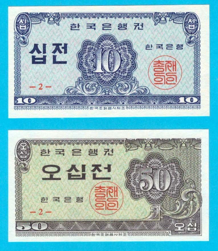 Coreea Sud Set 2x (p#28) 10+50 Jeon 1962 UNC 'Reforma Monetară' serie: -2- ; faţă: Valoarea; verso: Valoarea; material: hârtie; dimensiuni: 90x50 mm;