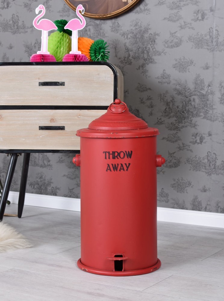 din metal vopsit rosu cu efecte de antichizare, prevazut cu o