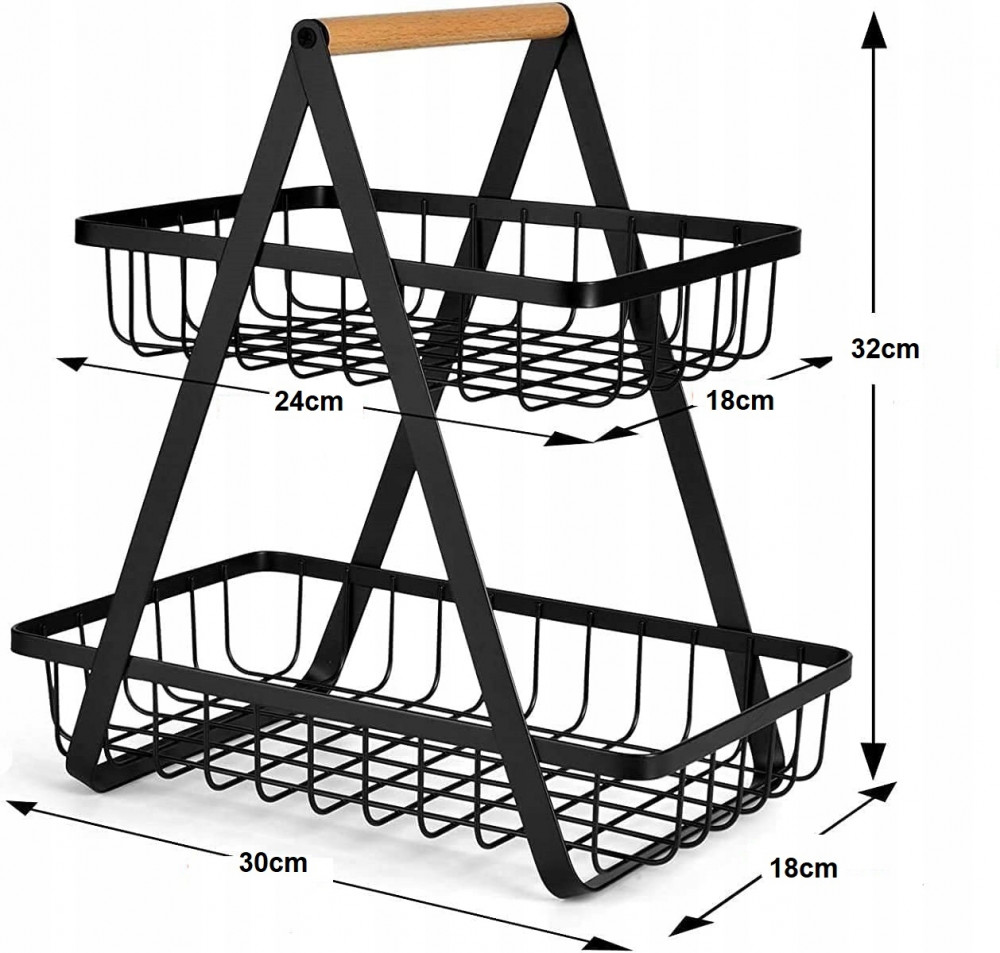 Cos pentru fructe, din Metal Lemn, cu 2 rafturi, 32x30x18 cm, Negru, TopBazar