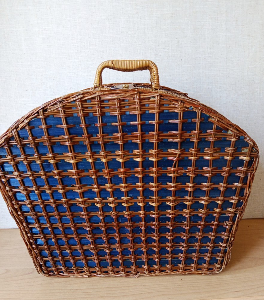 Cos de picnic din perioada anilor 80. Din nuiele împletite, căptușit cu material textil în carouri. Nu mai are vesela. Potrivit ca element decorativ în stilul rustic sau colonial.