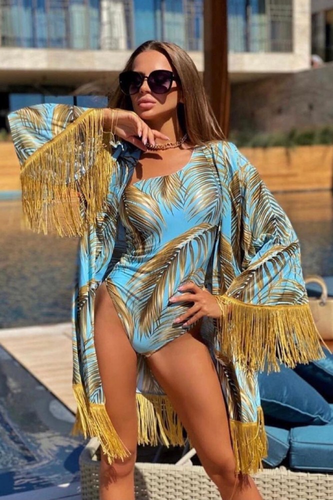 Costum de baie cu un umar gol, croiala mulata si efect modelator pe talie. Rascroiala este mai decupata pe picioare, acoperire medie la spate. Imprimeul cu frunze de palmier este foarte placut si in culori calde de vara. Pareo este de lungime medie cu terminatii decorative din franjuri aurii, semi-transparent din material fin si placut la atingere, maneci lungi tip clopot cu terminati de franjuri, care te va acoperi in zilele calduroase inspirand o atitudine sexy si misterioasa. Este un accesoriu la moda care nu poate lipsi din bagajul tau pentru vacanta. Potrivit pentru zilele petrecute la plaja. Il poti purta ca un accesoriu vestimentar de zi cu zi la un cocktail, dar si costumului de plaja i se alatura perfect. Material costum baie: bumbac si lycra Material pareo: voal fin Croi mulat Un umar gol Maneci lungi cu terminati din franjuri