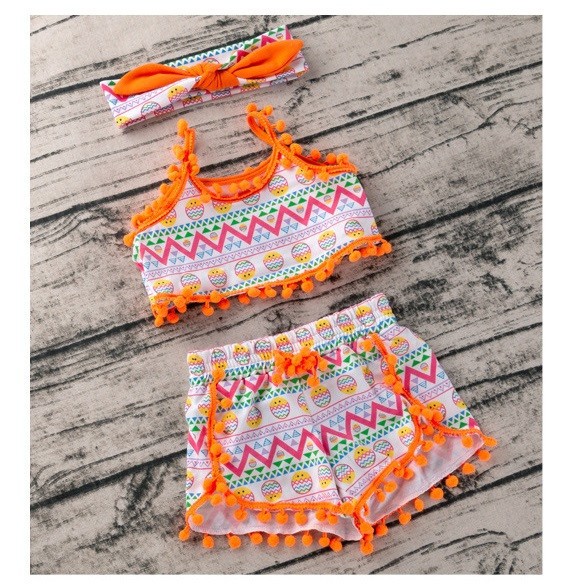 - maiou scurt cu bretelute, alb cu imprimeu viu colorat si cu ciucurei portocalii pe margini;