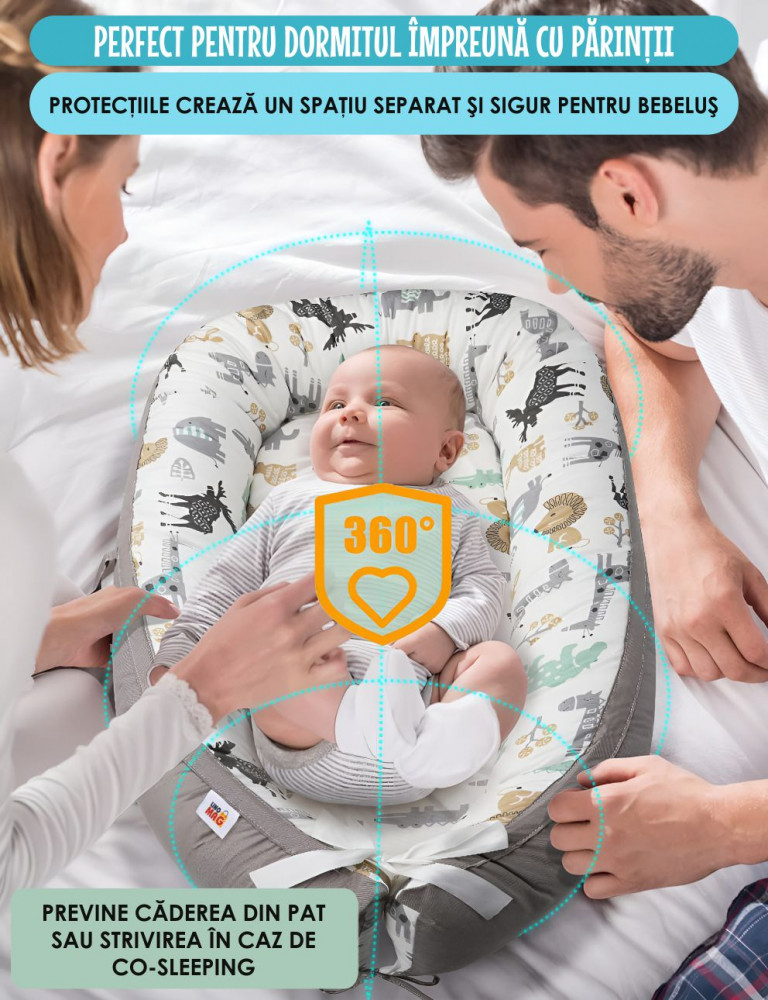 - Siguranță garantată – Asigură un spațiu delimitat, prevenind rostogolirea bebelușului.