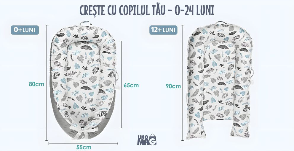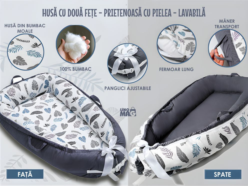 Cosulet Bebelusi pentru Dormit tip Baby Nest, Linomag®, cu Doua Fete, 0-24 Luni, 90x55cm, Husa Bumbac, Confort & Siguranta, Alb/Gri