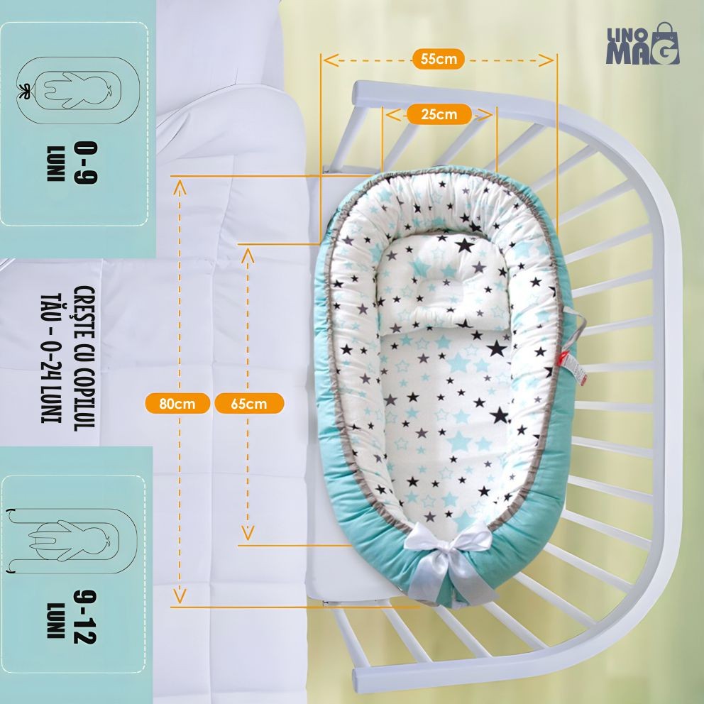 Acest Baby Nest moale și confortabil, este creat special pentru a oferi bebelușului tău un mediu sigur și relaxant pentru somn și joacă. Designul ergonomic imită senzația din burtica mamei, ajutând la reducerea anxietății și oferind un somn odihnitor. Realizat din materiale respirabile și hipoalergenice, protejează pielea sensibilă a micuțului. Ideal pentru utilizare acasă, în pătuț sau pe canapea, dar și în călătorii datorită designului său portabil.