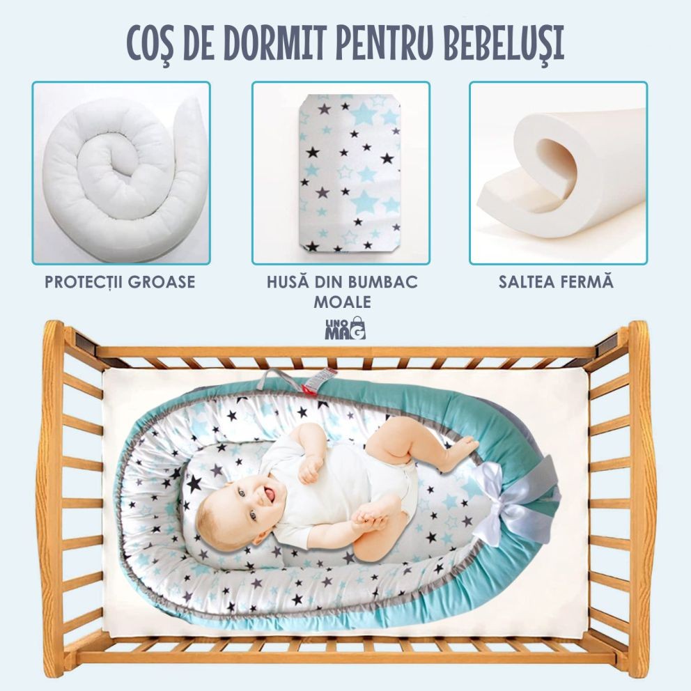 Cosulet Bebelusi pentru Dormit tip Baby Nest, Linomag®, cu Doua Fete, 0-24 Luni, 90x55cm, Husa Bumbac, Confort & Siguranta, Alb/Turcoaz