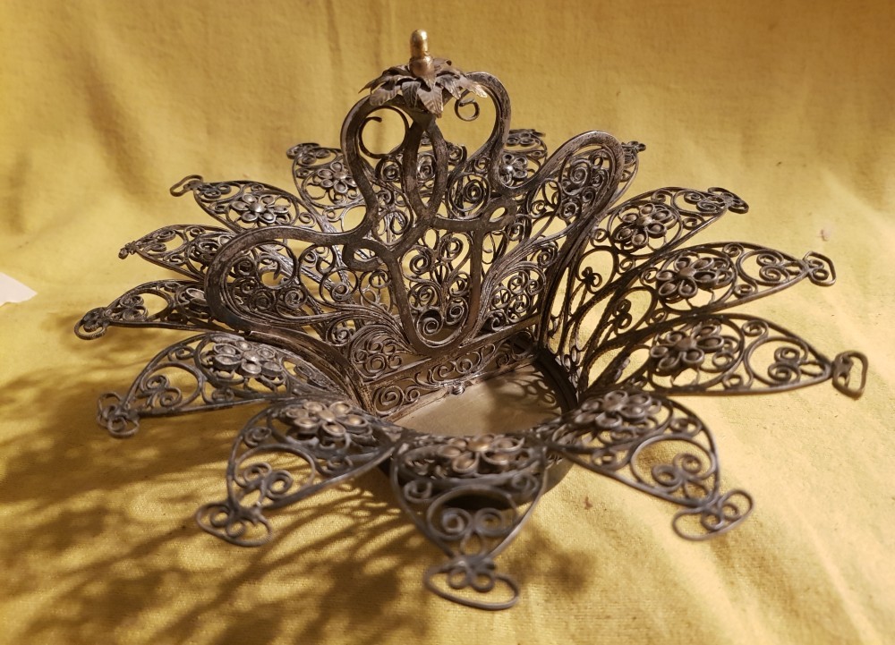 Cosulet din argint filigranat datat 1842 -text gravat cu caractere chirilice de mână-Enăkaki Constantin paharnic-dedesubt anul 1842 si marca argintului pruba( proba) 12 (argint 750)-dimensiuni-23x20x13 centimetri-greutate 366,8 grame-stare buna de conservare având în vedere vechimea -rog apreciere dupa fotografii.