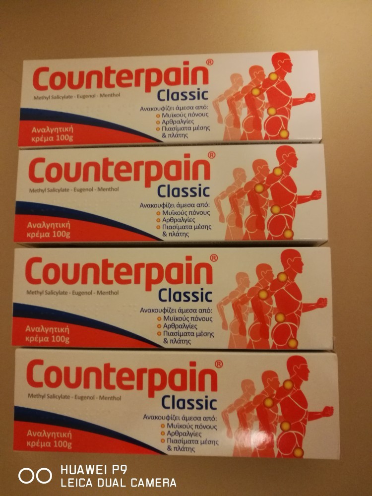 Counterpain Classic este un unguent care are un efect aproape instant, gratie formulei special conceputa pentru a reduce durerile de artrita,reumatism,durere de cot, dureri de incheieturi sau tendoane cauzate de rigiditate musculara, lovituri, rani sau entorse. Din parerile pe forumuri reise ca este cel mai bun unguent pentru aceste afectiuni. Atentie la acest produs care se contraface in Asia ,Thailanda.... Produsul original este acesta ,grecesc,produs de pharma swiss. Garantez originalitatea produsului.Cumparatorul plateste transportul. Pret per bucata 45 lei + taxa transport Optional se poate livra gratuit in Bucuresti,sector 6 .