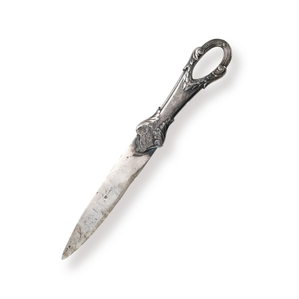 Coupe-papier realizat de bijutierul Radivon din București, conform poansonului de pe unul dintre mânerele cuțitului Dimensiuni 2 x 16,5 cm