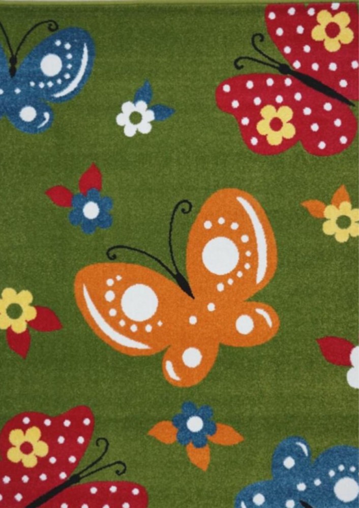 Covor Camera Copii Model Fluturi 11206-130, Marime 80 x 150 cm, Verde, Inaltime Fir 9 mm, Antialergic, Polipropilena, Gradinita, Cresa, Loc de Joaca