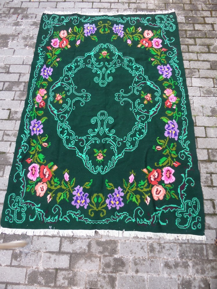 COVOR TESUT IN CILIM, AVAND O VECHIME DE APROX. 70 DE ANI, IN STARE BUNA, FARA DECOLORARI, PREZINTA LA UNUL DINTRE CAPETE DOUA MICI GAURI, GREU SESIZABILE SI O RUPTURA PE O PORTIUNE DE 2CM / 2CM, DIMENSIUNI: 145CM / 220CM