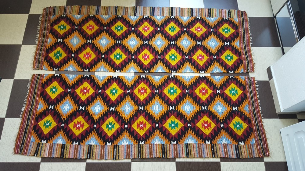 Este din doua bucati, a fost tesut la un razboi mai mic( de catre bunica mea). Se poate folosi ca doua covoare mai mici sau se poate imbina intr-unul mare.