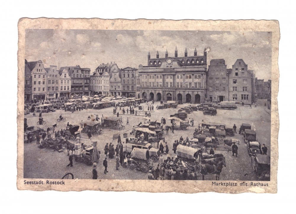 CP Germania - Rostock - Piata, interbelica, animata, necirculata, a fost lipita in album, are urme de lipici si din pacate e murdara.