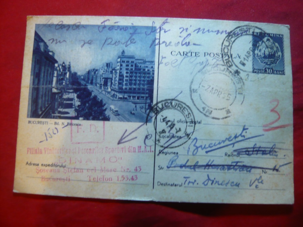 Carte Postala Ilustrata -Bucuresti -Bl.Balcescu 1955,cu stamp si Invitatie a Filialei Vanatorilor si Pescarilor din MAI