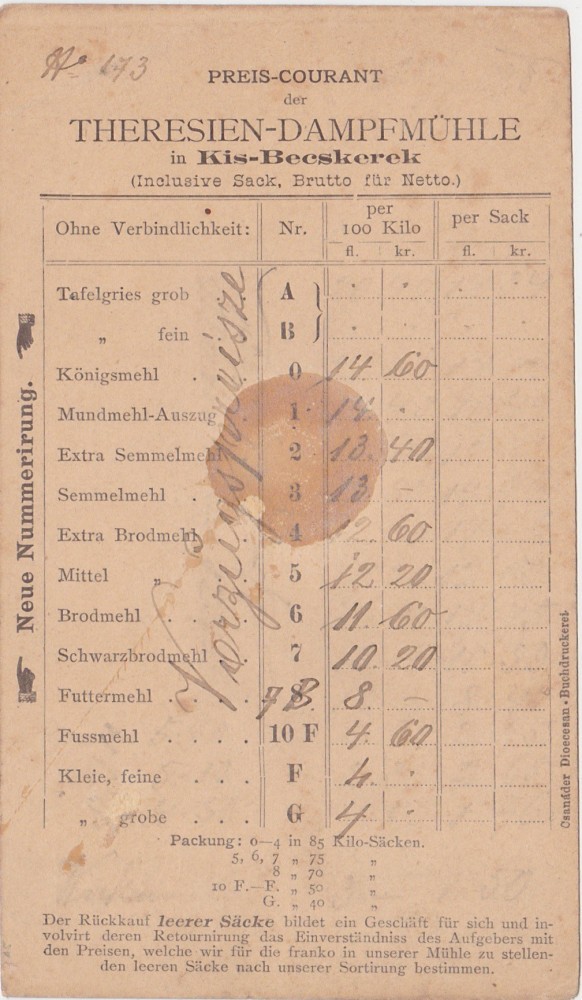 CP Theresien Dampfmuhle Kisbecskerek BECICHERECU MIC Moara cu aburi bon consum