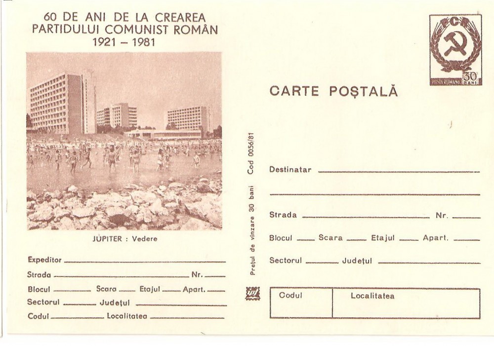CPI (B3372) CARTE POSTALA. JUPITER, NECIRCULATA, MARO, 60 DE ANI DE LA CREAREA PARTIDULUI COMUNIST ROMAN 1921-1981