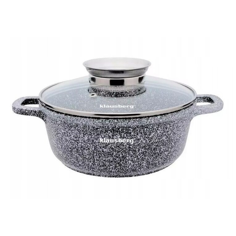 Oală KLAUSBERG acoperită cu un strat antiaderent de marmură ceramică. Echipat cu un capac de sticlă cu mâner Aroma Knob în care este plasat un dozator de ulei, datorită căruia poți servi ulei sau condimente lichide în timpul gătitului sau tocăturilor. Oalele din această serie din aliaj de aluminiu au un fund feromagnetic inductiv. Sunt adaptate pentru a funcționa cu orice tip de bucătărie, inclusiv cu inducție.