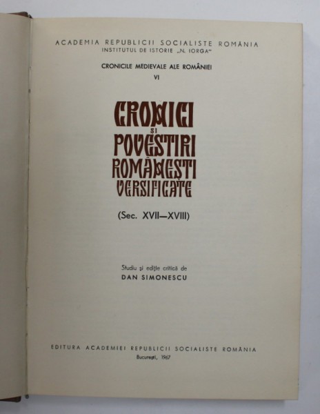 CRONICI SI POVESTIRI ROMANESTI VERSIFICATE ( SEC. XVII - XVIII ) , editie critica de DAN SIMIONESCU , 1967