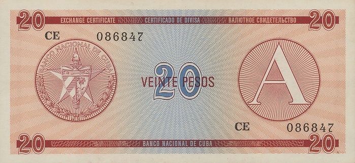 Splendida bancnota de 20 Pesos din Cuba 1985 (P-FX5) în stare necirculatã (UNC).
