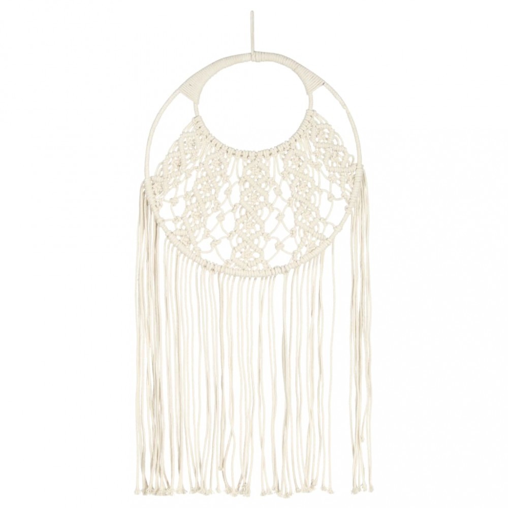 Acest cuier de perete este realizat manual din bumbac. Aspectul franjurat aduce in minte o atmosfera boema. In plus, cuierul de perete are o franghie in partea superioara, ceea ce face usor atasarea unui carlig.
