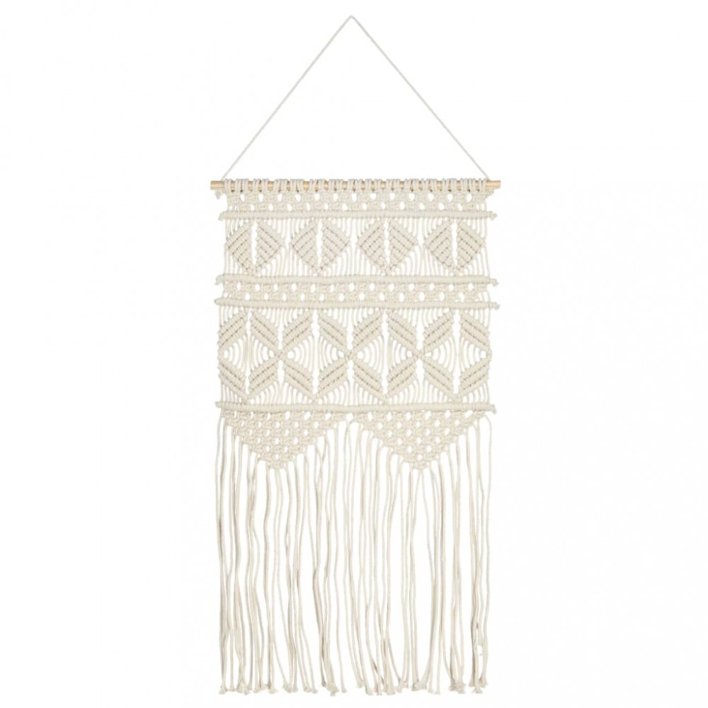 Acest cuier de perete este realizat manual din bumbac. Aspectul franjurat aduce in minte o atmosfera boema. In plus, cuierul de perete are o franghie in partea superioara, ceea ce face usor atasarea unui carlig.