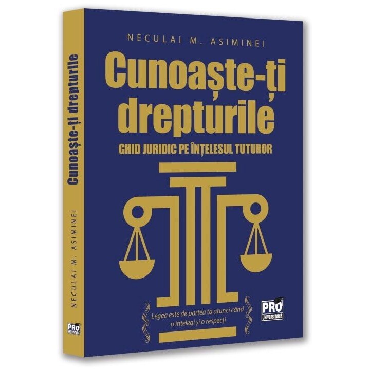 Intelegerea drepturilor tale este primul pas spre viata demna si echitabila! Ghidul juridic, ,,Cunoaste-ti drepturile” - este pentru a-ti da curajul de a face demersurile necesare, pas cu pas, fara costuri mari sau proceduri complicate. Indiferent ca te adresezi primariei, politiei, parchetului, instantelor de judecata, institutiilor europene sau internationale, ai acum la indemana cunostintele de care ai nevoie pentru a actiona cu incredere si fermitate. Fiecare pagina din acest ghid este o mana intinsa care te sprijina sa-ti protejezi drepturile si sa iei atitudine pentru justitia ta. Asadar, indrazneste! Dreptatea e de partea celor care actioneaza. (Neculai M. Asiminei)