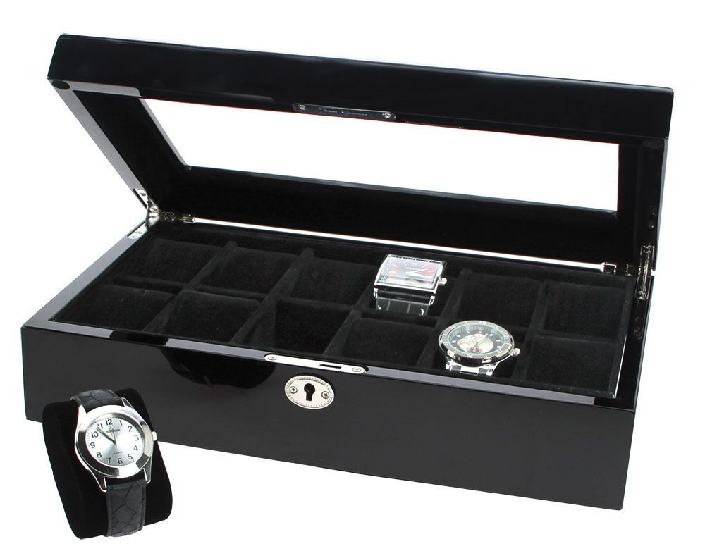 Cutie de depozitare extrem de eleganta pentru ceasuri de mana. Capac cu geam de sticla. Captusita cu velur fin de culoarea negru antracit. 12 pernute pentru ceasuri acoperite in catifea negru antracit - detasabile. Feronerie finute din argint cromat - cutia se poate incuia cu cheia. O cutie din lemn de inalta calitate acoperit in lac de pian. Dimensiuni aprox: 345 x 210 x 90 mm