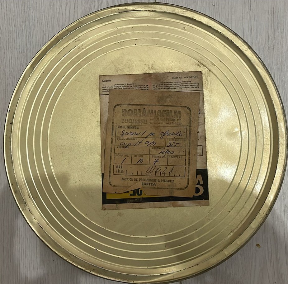Cutie 2 tablă rolă peliculă film Romaniafilm, perioada comunistă, SPOINUL PE GHEATA, Fabrica BUFTEA, epoca de aur, Ceausescu, 28 cm diam si 4.5 cm h