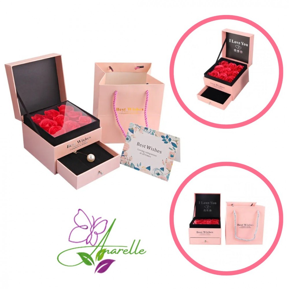 Cutie cadou 9 trandafiri săpun, felicitare, roz, 12x12x9,5 cm