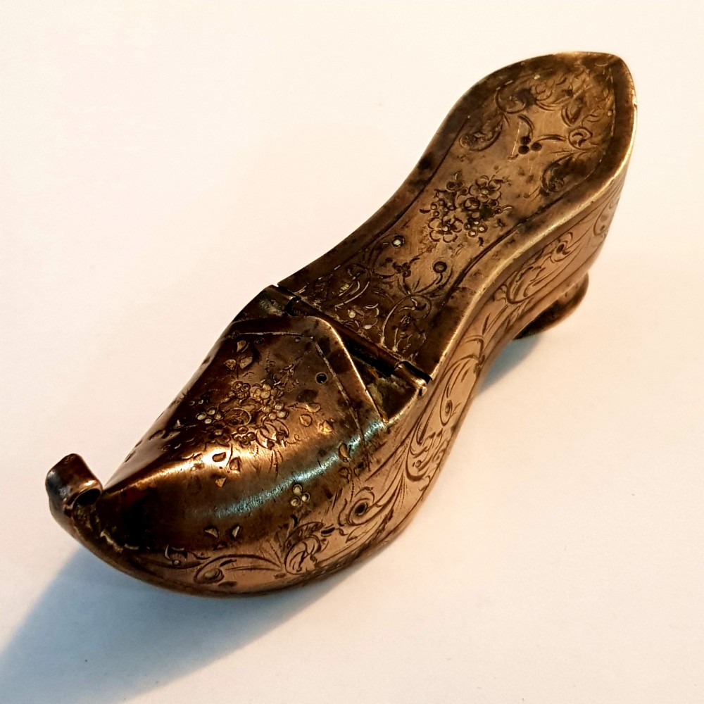 Cutie de prizat tutun din alama -forma de papuc turcesc-imineu-decorata manual cu motive vegetale si florale- a fost aurita-atelier oriental de secol 19-lungime 9,5 centimetri-3,3 centimetri inaltime -stare buna de conservare, rog apreciere dupa fotografii.