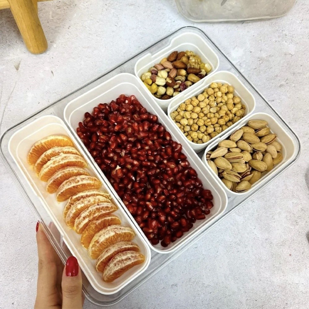 Cutie depozitare mancare pentru frigider cu capac etans si 5 compartimente detasabile, Pufo, 31 x 24 cm