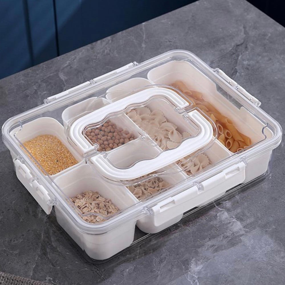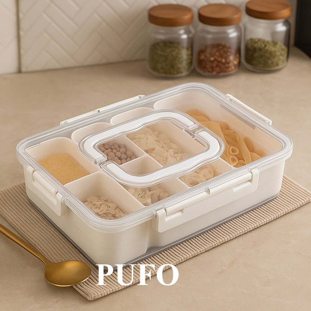 Cutie depozitare mancare pentru frigider cu capac etans si 6 compartimente detasabile, Pufo, 35 x 25 cm