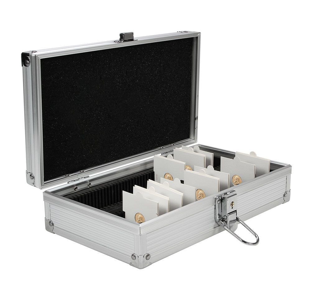 SAFE ALBUMS 295 Cutie din aluminium pentru monede in cartonase ____________________________________________________________ Interiorul este acoperit in catifea de culoare neagra. 2 randuri din supma, fiecare cu 50 locasuri. Carcasa din aluminiu are colturi si margini armate cu metal. Blocabil cu cheia - 2 chei sunt incluse. Dimenisuni exterioare: 260 x 155 x 70 mm
