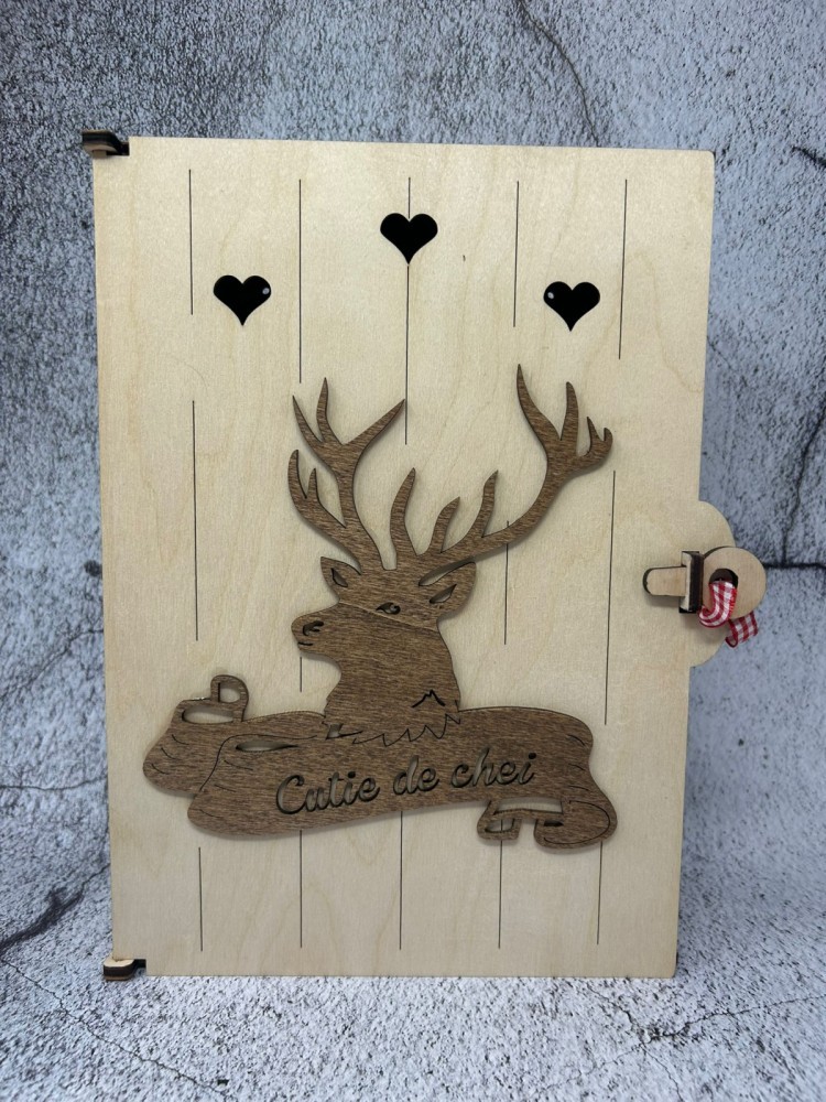 Cutie de chei din lemn, eleganta si practica, cu design rustic si gravura decorativa de cerb. Realizata din lemn natural, aceasta cutiuta este perfecta pentru organizarea si depozitarea cheilor intr-un mod estetic. Dispune de decupaje in forma de inimioare si un sistem simplu de inchidere, fiind ideala pentru hol, cabane, pensiuni sau locuinte cu decor traditional. Un accesoriu util si decorativ, potrivit si ca idee de cadou.