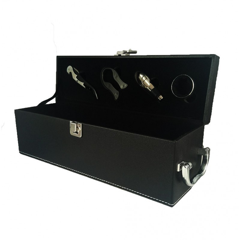 Cutie pentru o sticla de vin cu accesorii realizata din piele ecologica neagra, decorata cu o cusatura alba. Se inchide cu o clema iar pe partea din dreapta are un maner pentru transport. Accesoriile incluse sunt: tirbuson profesional, accesoriu pentru turnare, taietor capison si inel antipicurare.