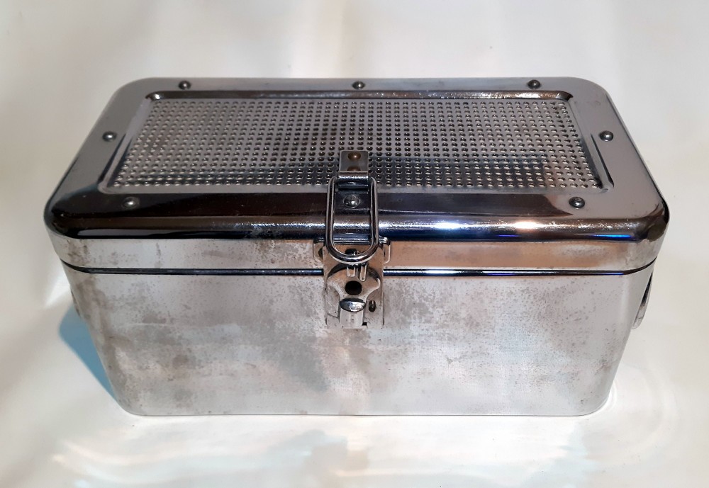 Cutie din inox, pentru sterilizare instrumentar medical, dimensiuni: 310x170x150mm., in stare excelenta, ca noua.