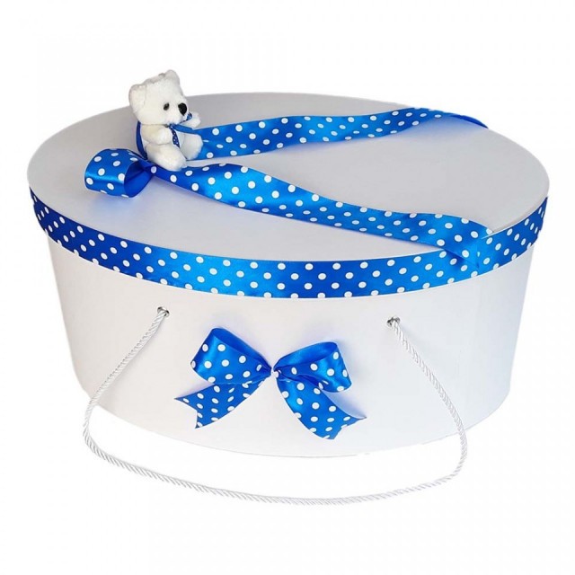 Cutia are forma ovala si este realizata din carton gros, rezistent. Poate fi utilizata dupa botez ca si cutie de depozitare a jucariilor sau a amintirilor dragi.