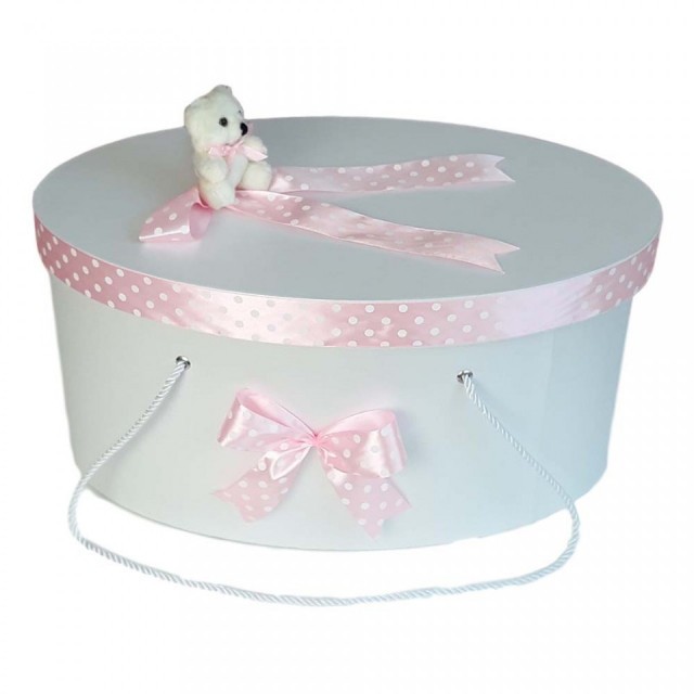 Cutia are forma ovala si este realizata din carton gros, rezistent. Poate fi utilizata dupa botez ca si cutie de depozitare a jucariilor sau a amintirilor dragi.