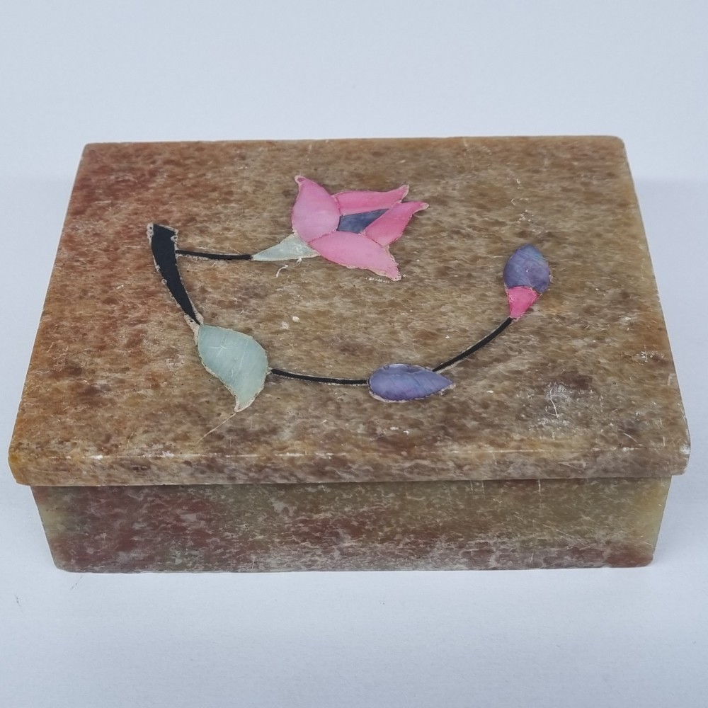 Cutie veche bijuterii scluptata, din piatra cu insertii de sidef