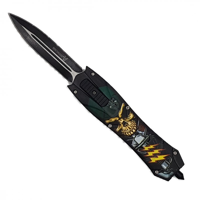 Cutit briceag deschidere a lamei automata pe buton, lama otel, dispozitiv spart geam, cap de mort