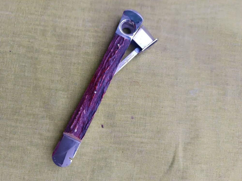 Este un briceag cu accesorii pentru pipa, are un maner din corn de