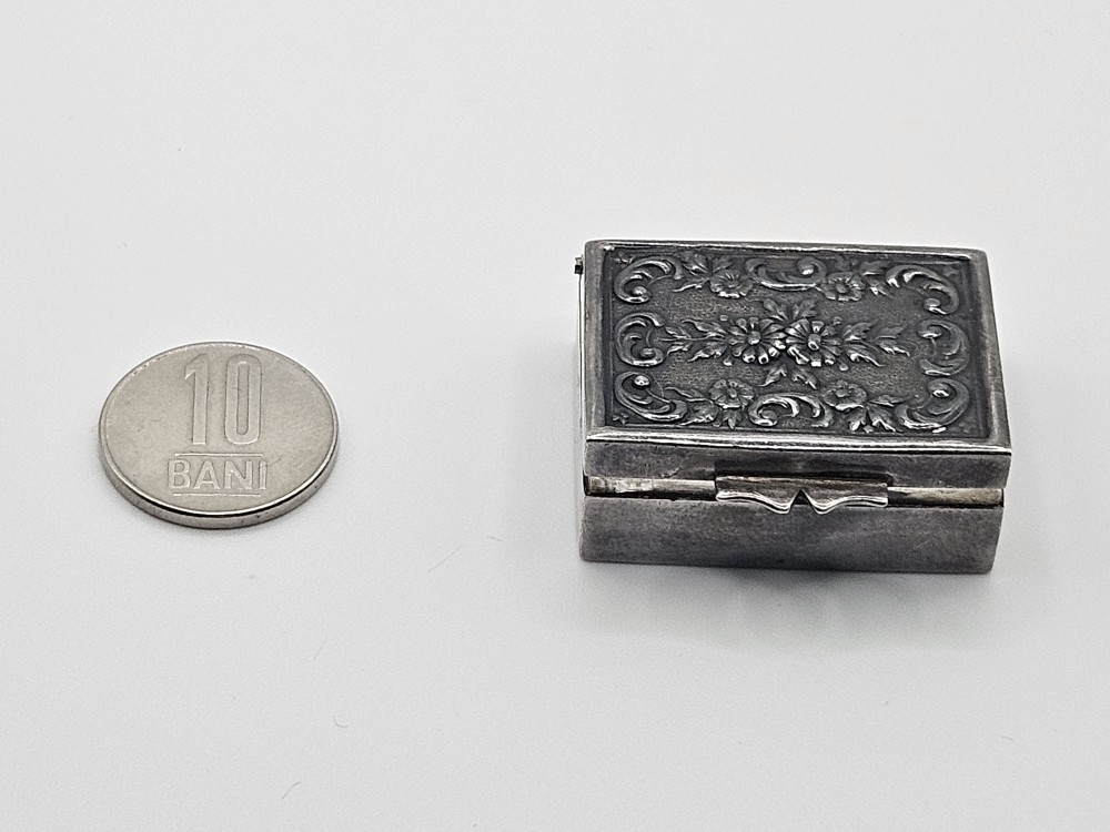 Cutiuta din argint , marcaj argint Spania, greutate 15.55 gr, dimensiuni 3.5 cm x 2.6 cm x 1.3 cm, in stare buna, cumparati cu incredere, orice produs se poate returna!