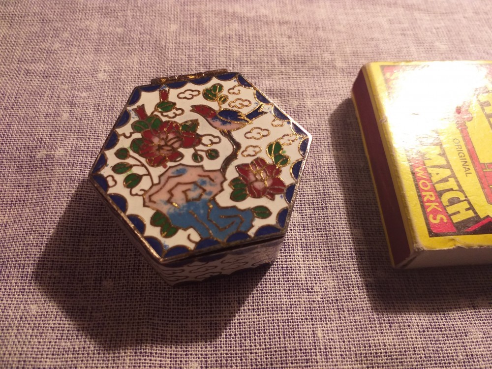 Cutiuta hexagonala din bronz cu motive florale din email. Dimensiunea intre laturi este de 38 mm. Capacul este cu balama. Pretul include transportul.