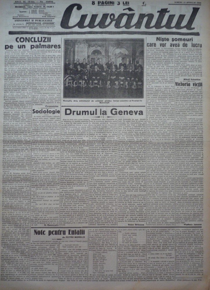 Cuvantul, ziar legionar, 14 Aprilie 1933, artocole de Mihail Sebastian, Perpessicius, racoveanu, afacerea Skoda