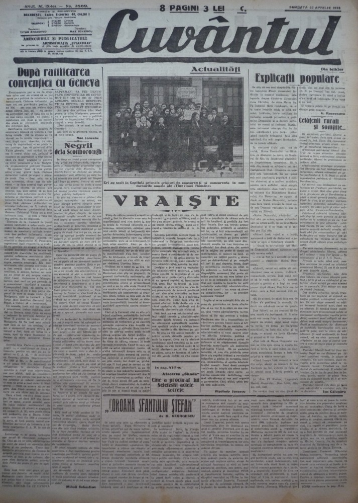 Cuvantul, ziar legionar, 22 Aprilie 1933, articole de Nae Ionescu, George Racoveanu, Ion Calugaru