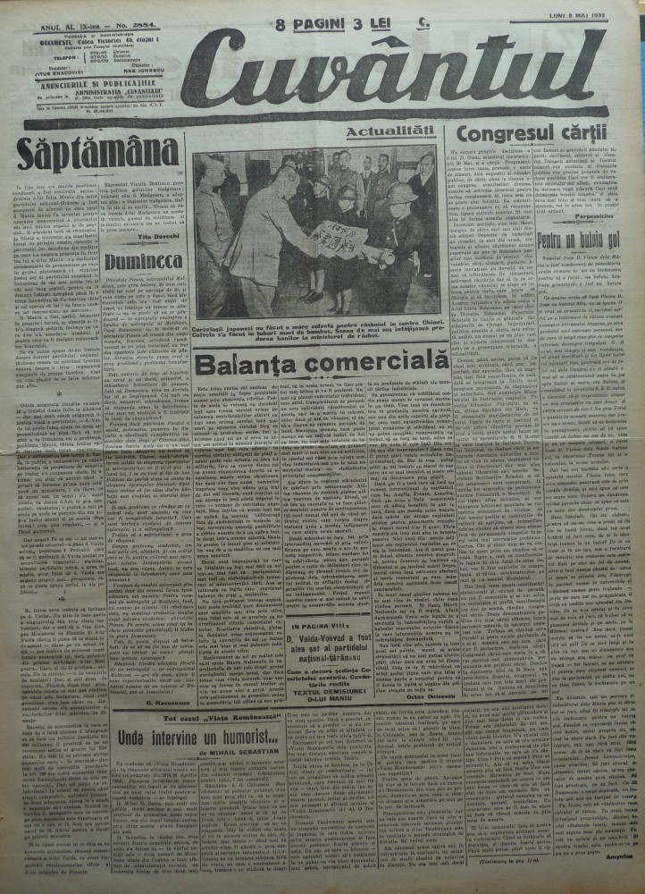 Cuvantul, ziar legionar, 8 Mai 1933, articole de Mihail Sebastian, Perpessicius, Ion Calugaru
